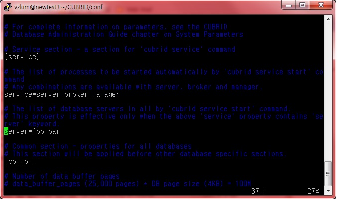 위의 적색으로 표시된 부분이 “cubrid service”명령어가 제어할 부분이다. Server는 Database서버, broker는 미들웨어, Manager는 CUBRID Manager Server이다. CUBRID Manager서버를 “cubrid service”명령어의 제어권 밖으로 보내고 싶다면 위의 service항목에서 제거하면 된다. 모든 서비스의 별도 구동을 원한다면 service를 주석처리(#)해주면 된다.